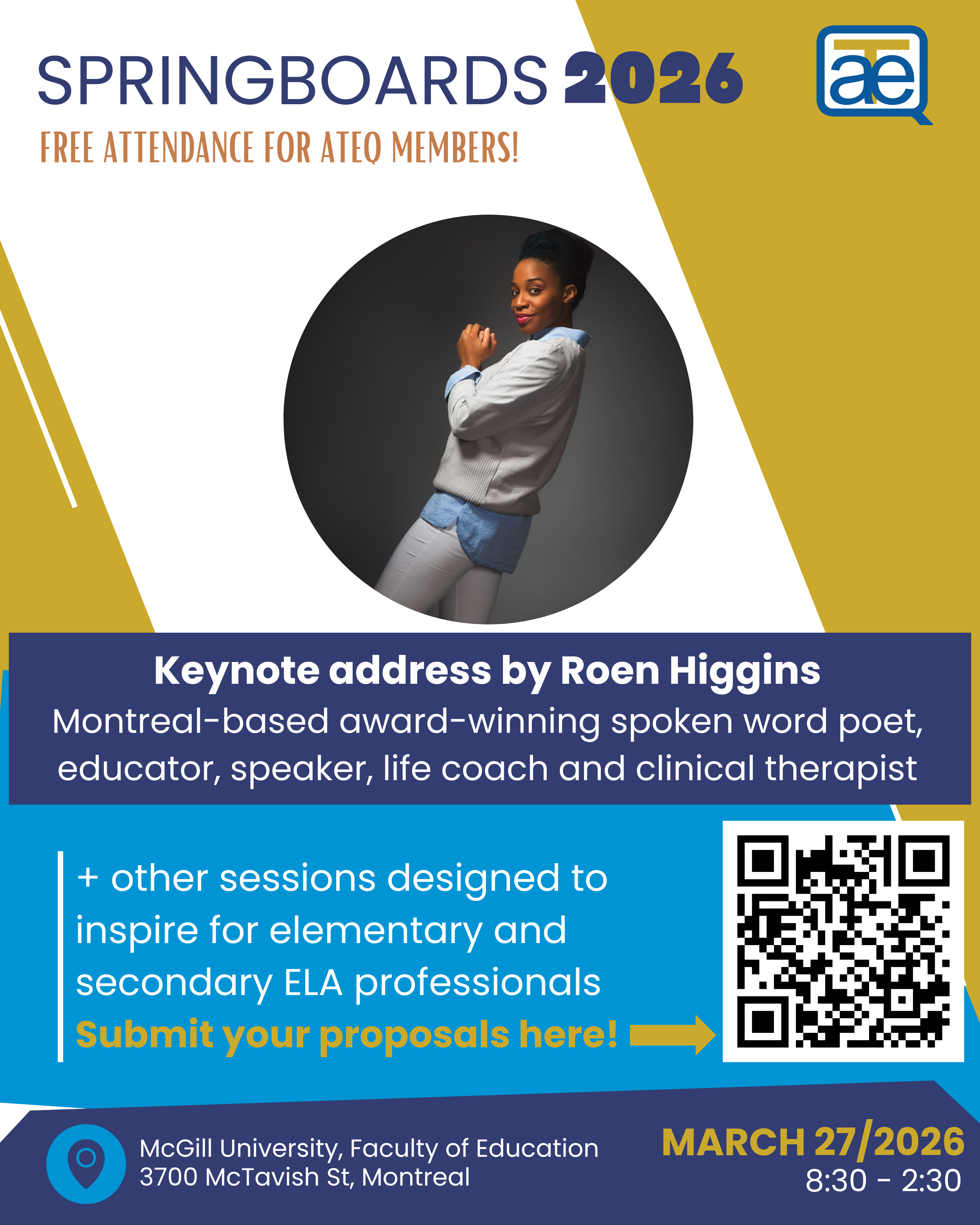 Springboards 2026 will take place on March 27th at McGill University (Education Faculty) with a keynote from Montreal-based award-winning spoken word poet, educator, and speaker Roen Higgins! Register here.